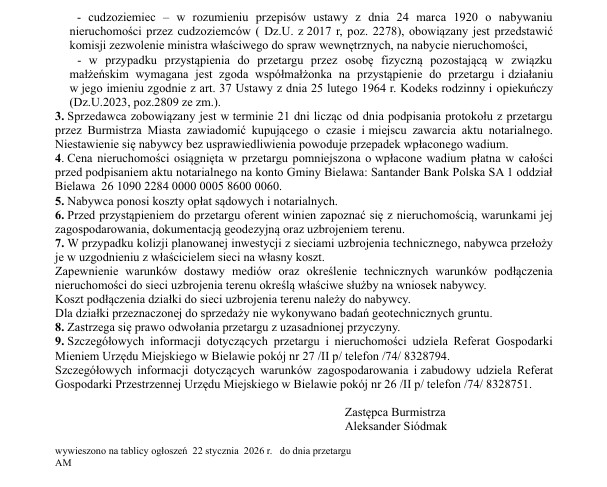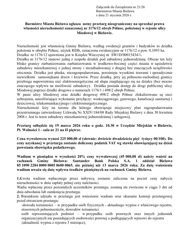 Burmistrz Miasta Bielawa ogłasza ustny przetarg nieograniczony na sprzedaż prawa własności nieruchomości oznaczonej nr 1176/12 obręb Północ, położonej w rejonie ulicy Miodowej w Bielawie.