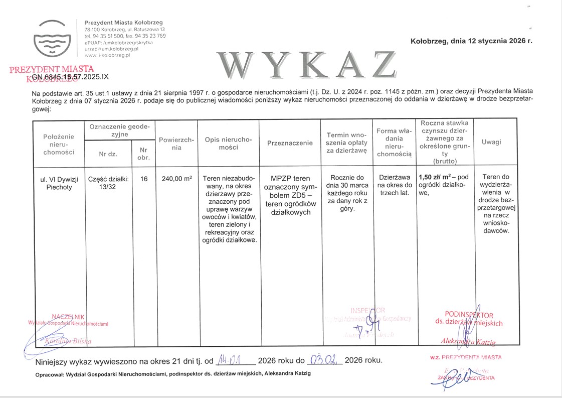 Prezydent Miasta Kołobrzeg informuję, że zgodnie z art. 35 ust. 1 ustawy
