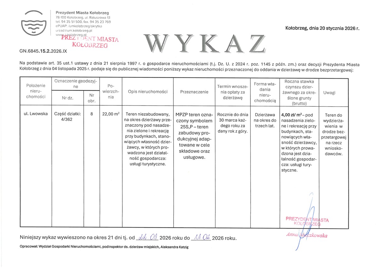 wywieszony wykaz nieruchomości przeznaczonej do dzierżawy tj.: